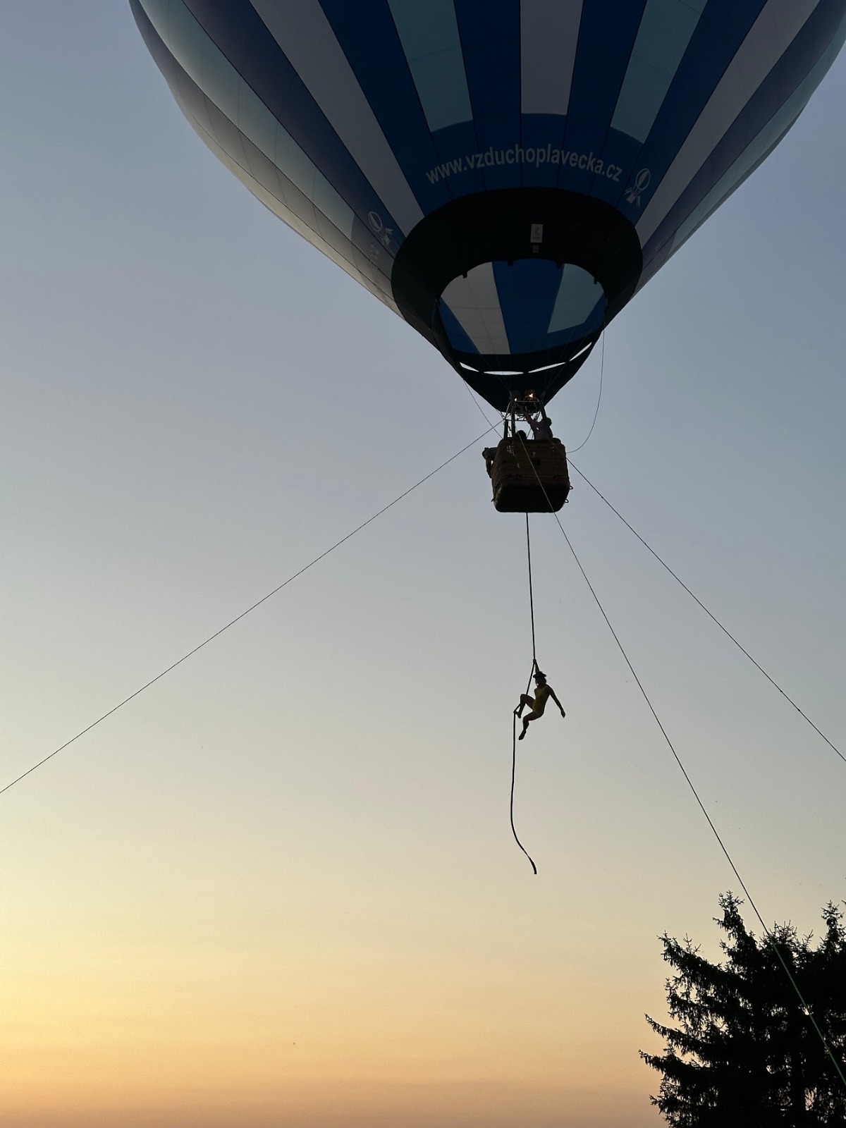 Once upon a time... in 1874, a man named Henri Beudet arrived in Prague. A Frenchman, a balloonist, part visionary and part acrobat. He brought with him a massive hot air balloon – over a thousand cubic meters of air! He took off from the Royal Garden, where he built a special furnace because his balloon didn’t have its own heating system. And beneath this balloon, suspended on a horizontal bar, he performed acrobatics. At a height where one can no longer rely solely on solid ground beneath their feet... This historical curiosity inspired the new circus project Aerial Sailors – a performance for two acrobats and one real pilot, taking place outdoors. Together, they explore what the body can express both in the air and on the ground. How high one can climb, what can be seen from above, and what the world looks like when experienced upside down – both literally and figuratively. Aerial Sailors is an invitation to explore space – both that which lies beneath our feet and that which floats above us.